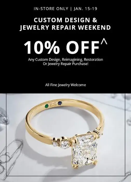 Cannot be combined with any other offers or discounts. Available in store only during the Custom Design & Jewelry Repair Weekend when payment is made in full. Custom Design discount cannot be redeemed on loose diamonds and gemstones, previously owned jewelry, protection plans, purchases made with trade-ins, or on previous repairs or services. Any fine jewelry qualifies for this offer - we work on gold, platinum, and sterling silver jewelry. Applicable on in-store care, repair or custom design services only. See Jewelry Expert for details. Valid through 01/19/26.